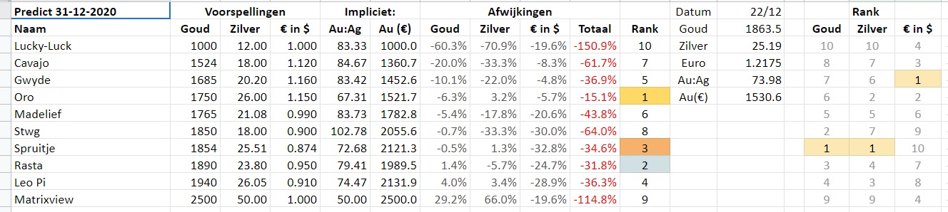 De sell-off op de beurs heeft ook de versteviging van de edelmetalen opnieuw gefnuikt. Per saldo blijven we ongeveer ter plaatse trappelen; goud sluit oktober af op $1878.60, zilver op $23.64. De euro noteert aan 1.165. Dus geen noemenswaardige verschuivingen voor onze eindejaarspoll